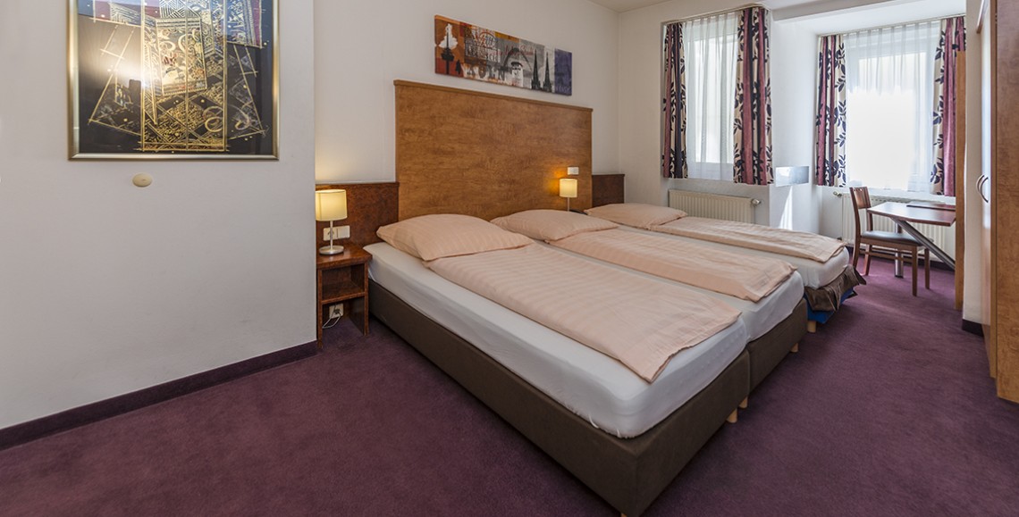 Unsere Dreibettzimmer sind sehr beliebt bei kleinen Gruppen und Familien. Unsere Zimmer sind mit drei Einzelbetten ausgestattet, können aber auch zur Doppelzimmernutzung gebucht werden, solange das Zimmer außerhalb eines Messezeitraums gebucht wird.